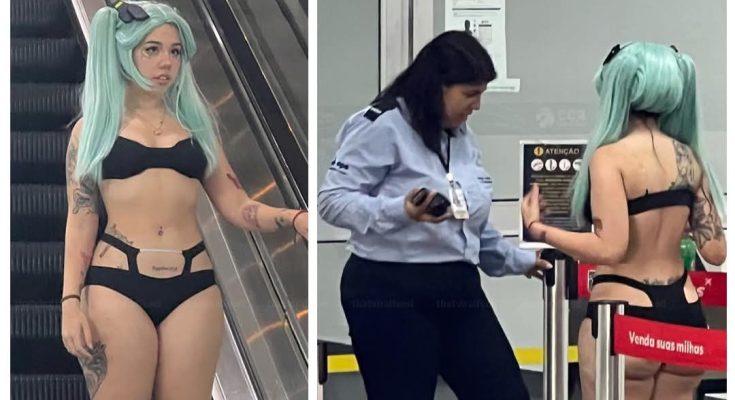 Brazilian model and cosplayer Kine-Chan dressed up as Rebecca, a character from the anime series Cyberpunk: Edgerunners (2022), wearing a black bikini, a blue wig, and black sandals to attend an event. Afterward, she headed to Navegantes Airport in Brazil to catch a flight. According to her, airline staff denied her boarding due to what they deemed “inappropriate” attire.