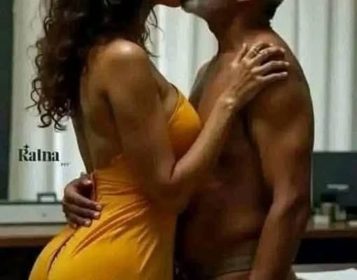 This image is a digital painting or stylized artwork depicting a couple sharing an intimate moment. The artwork is characterized by warm tones, predominantly shades of yellow, orange, and brown, creating a cozy and passionate atmosphere.